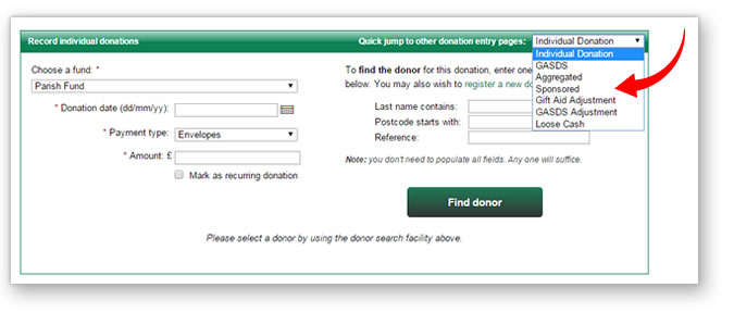 Each of the main donation entry pages features a ‘quick jump’ pull-down top right of the header bar on each donation entry panel. This takes you straight to any of the other pages used for recording gifts.