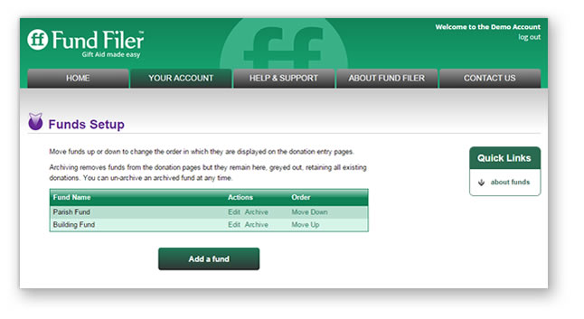 Simply click ‘Add a fund’ and give it a name in the box that appears. Once created, your new fund will be offered on all the donation entry pages.